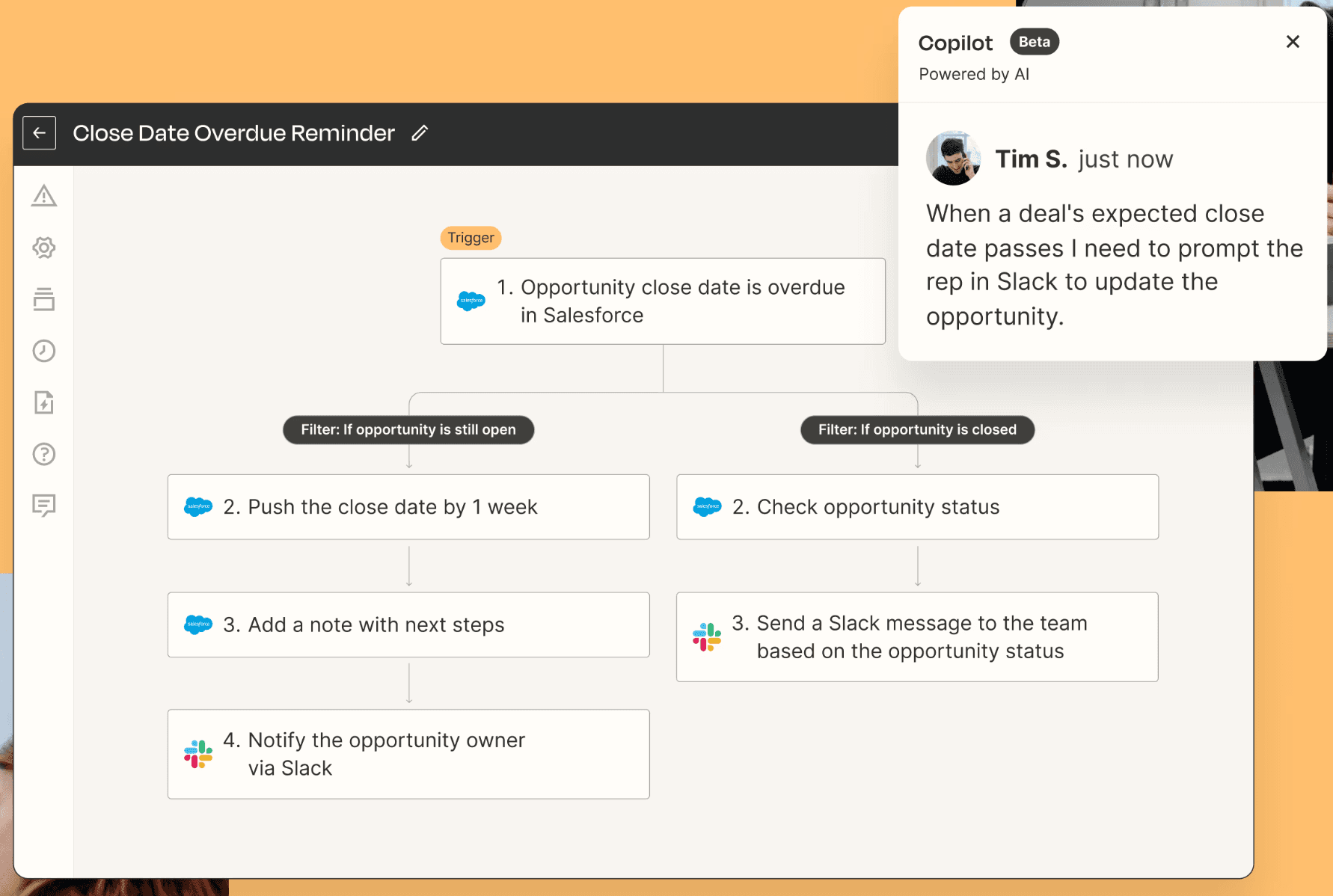 Filters, Paths & AI Actions fire real‑time Slack / email alerts when deals stall or NPS turns risky.